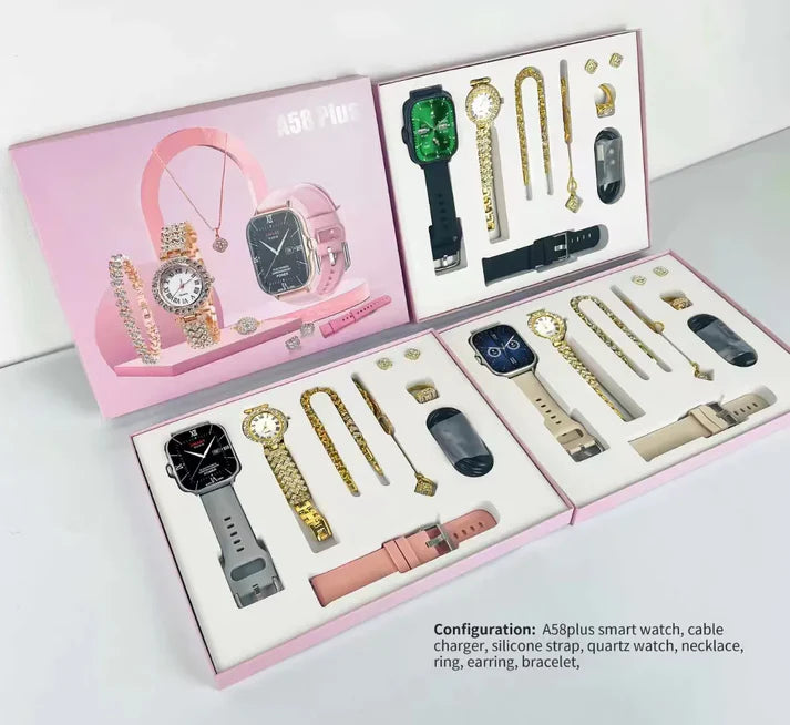 5-in-1 Smart Watch Gift Set with Women’s Jewelry Suits – A58 Plus Smartwatch